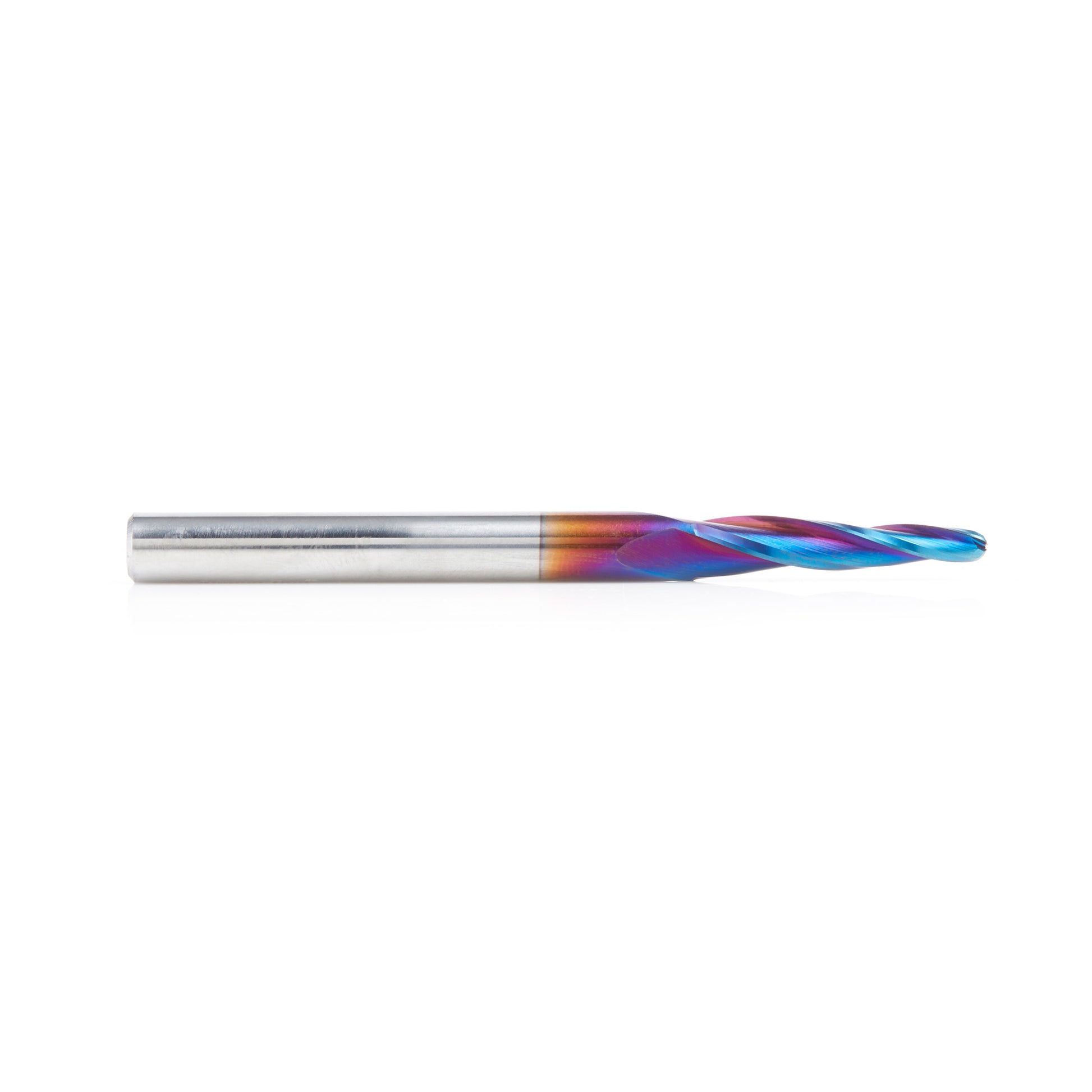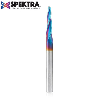 Specially designed for 2D and 3D CNC profiling and carving in plastic wood with CNC machines. The high-shear ball nose tips cut smooth 2D and 3D contours with reduced stepping while the proprietary Spektra coating (applied by the physical vapor deposition coating process) provides high resistance to wear, sharper cutting edges, extended tool life and less friction and heat buildup. Some of Amana Tool carving tools, as you can appreciate have a very small diameter therefore any material chip-loads need to reflect that small size. It can however withstand RPMs up to 60,000 RPMs. A directed air-blast to keep chips away along with cooling the tool and work piece are always welcome.
