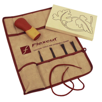 Our 5-Piece Craft Carver Set comes with four carving blades, a quick connect ABS handle, leaf project carving blank, and an 11-pocket tool roll. An owner's manual is also included with step-by-step instructions for completing the project. Profiles included: