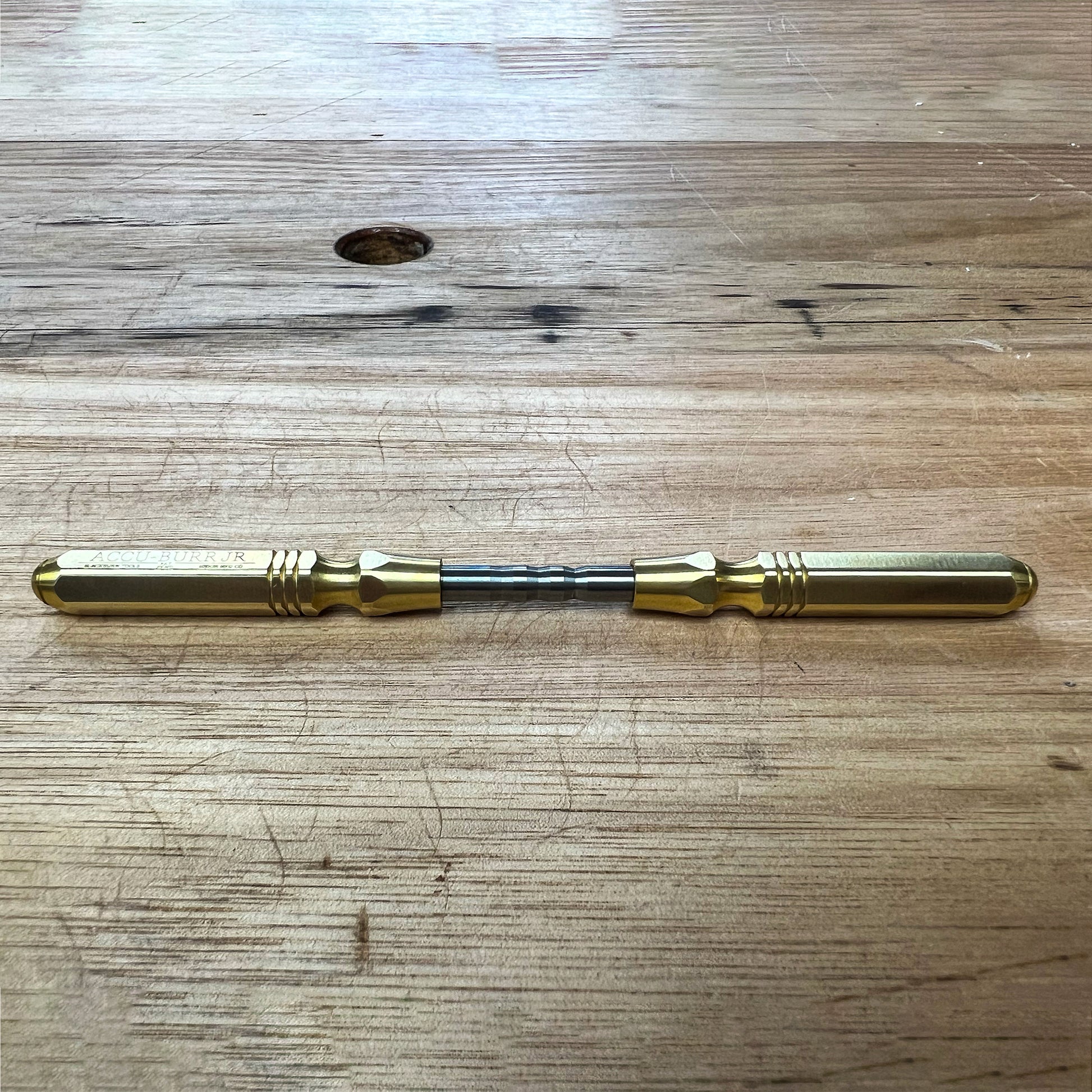 Never struggle to turn a burr on a card scraper again!The ACCU-BURR™ is simple, easy and repeatable. A completely new type of burnisher crafted in USA by Union Manufacturing Company in collaboration with Blackburn Tools & Lakeshore Carbide.The heart of the patent pending Accu-Burr™ burnisher is a 3/16" diameter carbide rod with three v-shaped grooves around the middle. These grooves are precision ground to turn a fine, medium, or coarse (5°, 10°, or 15°, respectively) burr simultaneously on both sides of any prepared scraper edge. Because quality and precision matter greatly for the function of this tool, we use a premium American-made grade of carbide, sourced from and ground by Lakeshore Carbide, a leading carbide tooling manufacturer.This clever tool will put a burr on both sides of your scraper at once, making it twice as fast! As you are not trying to angle the tool itself, this also makes turning a burr on curved scrapers, along with scrapers of varying thickness, far easier than ever before. The textured V-grooves on the carbide rod are both extremely effective, but also provide feedback through use - you can 'feel' the tool doing it's job. The three machined angles in the rod are all you will ever need whether your task is removing old finish or taking the final shavings for the perfectly prepared surface. This quality tool will provide exceptional results, faster than ever and even makes the task enjoyable! As beautiful to own as it is to use, investing in an Accu-Burr™ is an investment in yourself and the work you do. This tool should be in every woodworkers shop and is the only burnisher you'll ever need.Also available as the machined Carbide Rod without handles, so you can custom make your own - especially when paired with the beautiful Phosphor Bronze ferrules. Of course, if you're going to make the worlds best burnisher, you should pair it with a quality card scraper - enter the Union Manufacturing Blue Steel Scraper with a Flux-Cool™ finger saver!