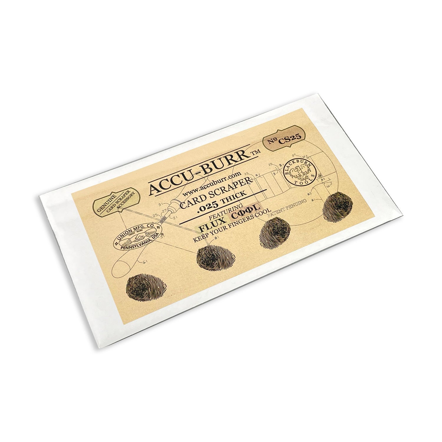 If you're going to offer the World's Best burnishing device, you should really pair it with a quality Card Scraper!Card scrapers are often referred to as 'Cabinet Scrapers' and are thankfully seeing a return to favour amongst woodworkers. These simple tools are incredibly effective and useful for a variety of tasks in your shop and can even replace sandpaper to finish your project! Union Manufacturing Co. offer this premium quality blue-tempered 1095 spring steel card scraper, hardened to 48-51 Rockwell, complete with a Flux-Cϕϕl Magnetic finger saver. This tool will hold an edge well but is easy to sharpen, especially when combined with the Accu-Burr™ Carbide Burnishing tool which makes quick work of turning an edge burr.But what is a Flux-Cϕϕl Magnetic finger saver? Well, as anyone who has used a cabinet scraper knows, the friction in use can cause the tool to heat up quite quickly and get uncomfortably hot under finger or thumb. The Flux-Cϕϕl is simply a thick magnet that you can place on the scraper where your fingers or thumbs rest. It is flexible enough not to impede flexing for use, but is remarkably effective at dispersing heat build up, enabling longer scraping sessions, more comfortably. A delightfully simple solution!The Accu-Burr™ Scraper is 152 x 63 x 0.63 mm (6" x 2-1/2" x 0.025") and sold individually, including a single Accu-Burr Flux-Cϕϕl magnet.