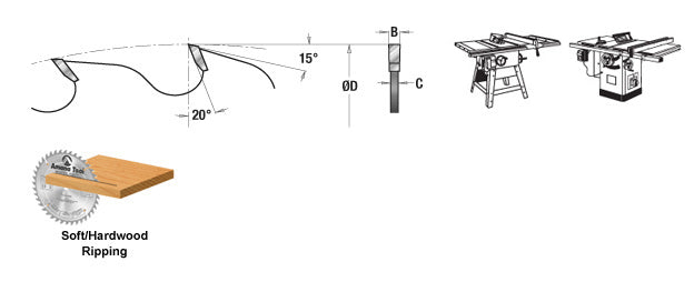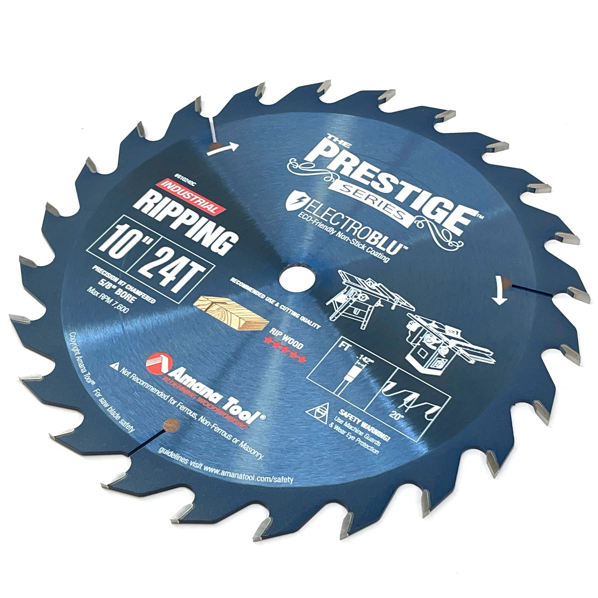 Amana's Prestige Series Electro-Blu coat blades are the top-of-the-line, premium blade offering!This blade is a classic high-end ripper for both hardwood and softwood. It features a much sought-after flat-top grind for cutting with the grain efficiently while leaving a flat bottom cut; ample gullets for fast chip-clearance; expansion slots with turbulence-reducing copper plugs; a 20° hook angle, 24 Teeth and a 5/8" Bore; with a thicker 2.4mm plate with 3.6mm kerf and mirror polished tungsten carbide tips.This is a serious and solid performer.