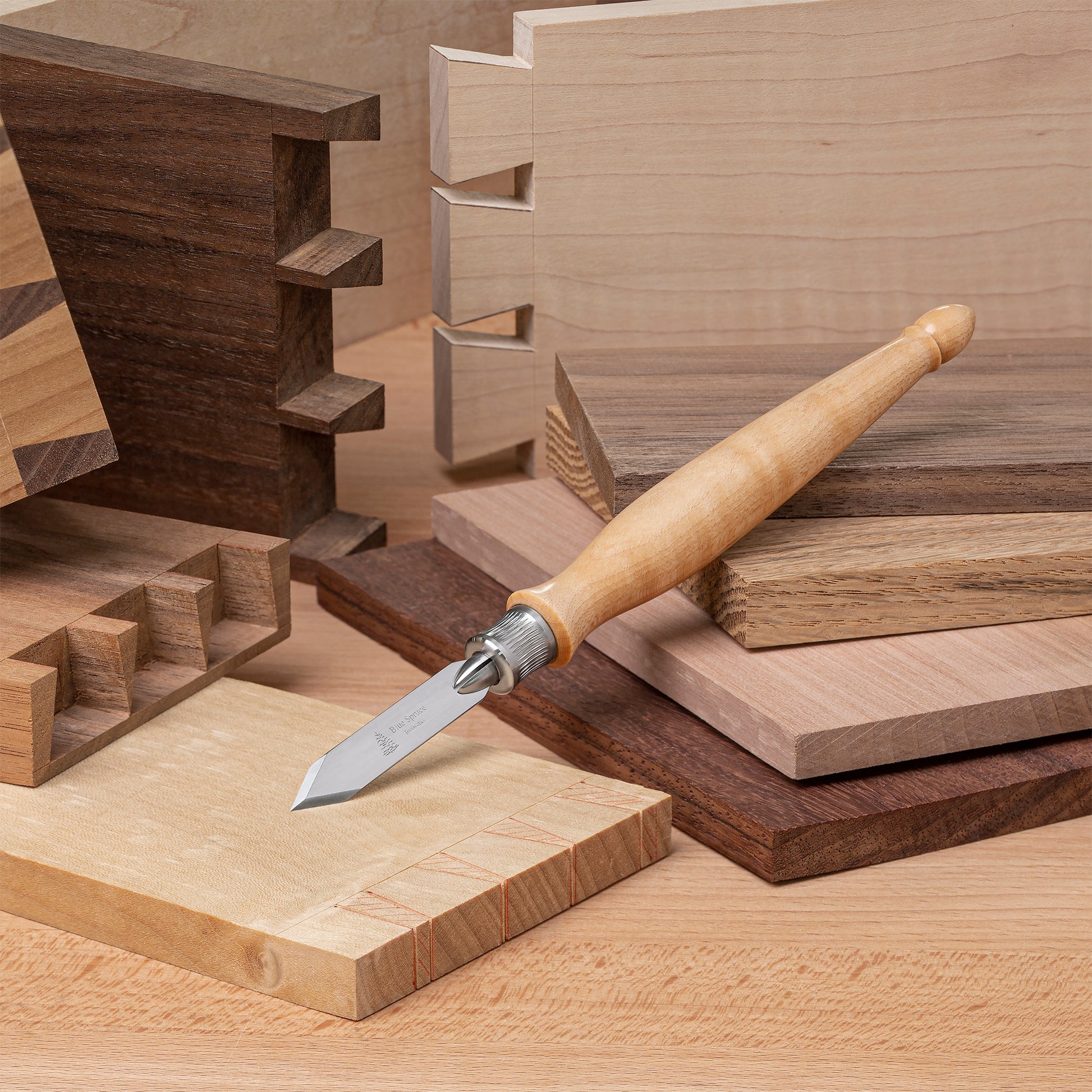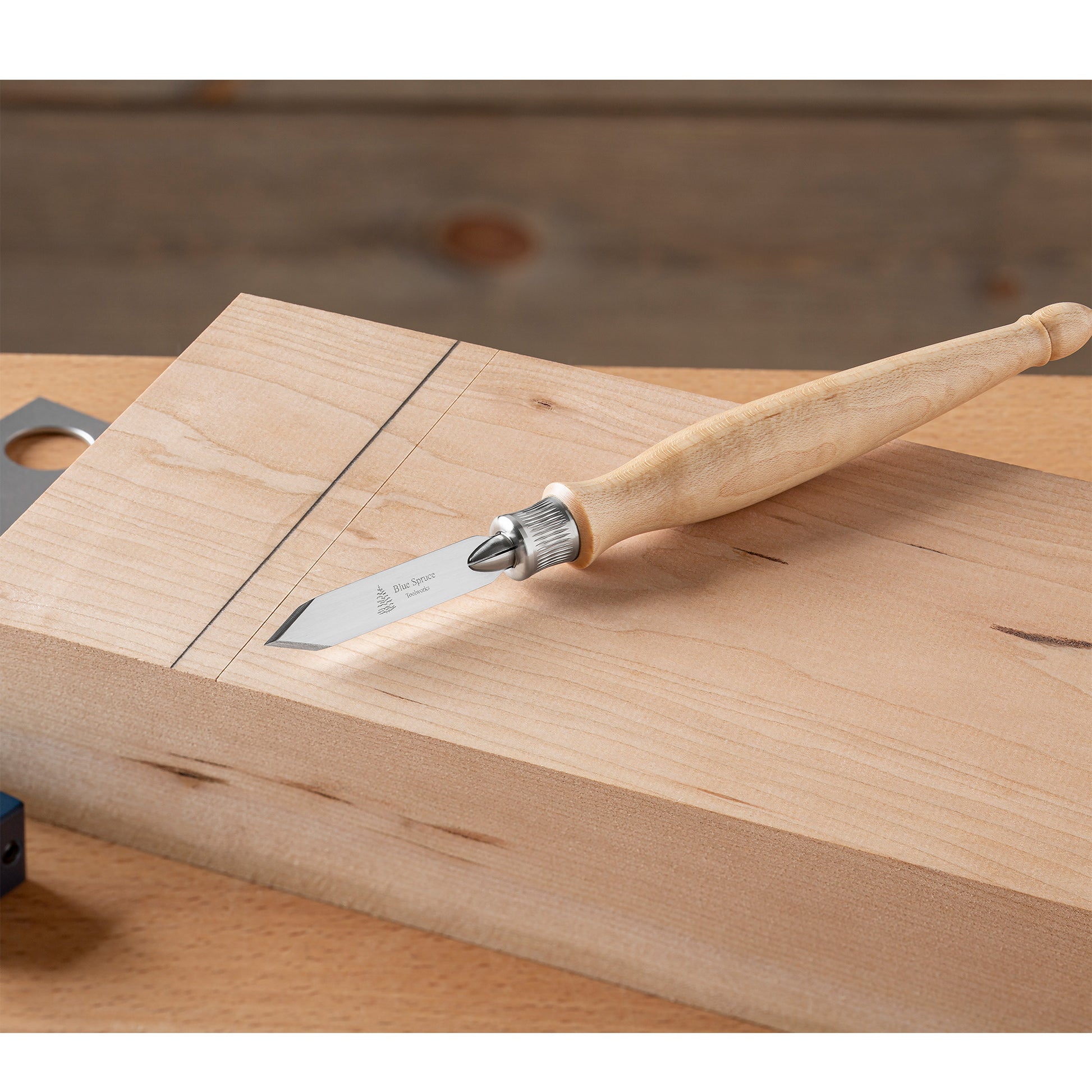 Upgrade your hand-cut joinery with the Blue Spruce Toolworks Classic Marking Knife. Unlike a pencil, this marking knife creates a physical impression in the wood, guiding your saw or chisel for precise cuts. The comfortable, contoured handle in Resin-Infused Curly Maple houses a 0.8 mm blade secured by a tool-less collet system. This allows for quick blade changes, so you can maintain a sharp edge without interrupting your workflow.The spear-point blade design works equally well on both sides; simply flip the knife to place the flat side against your square or straight-edge. The bevel ensures perfect alignment with your reference mark. The Classic Marking Knife is compatible with the entire range of Blue Spruce Toolworks Marking System blades and collets, making it a versatile addition to your toolkit.