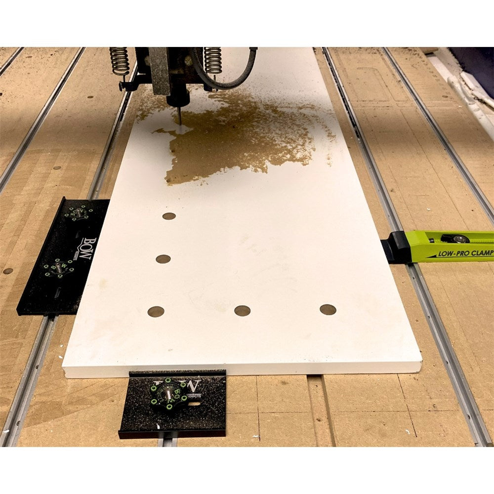 Bow Products has now released one of the most versatile low profile clamping kits for use on CNCs, t-track tables, dog tables, wooden workbenches or simply any wooden surface. The BOW-LCP1 features four interchangeable clamp tips that provide a range of clamping options, two clamps, two fences and all the required hardware you need for proper securement.