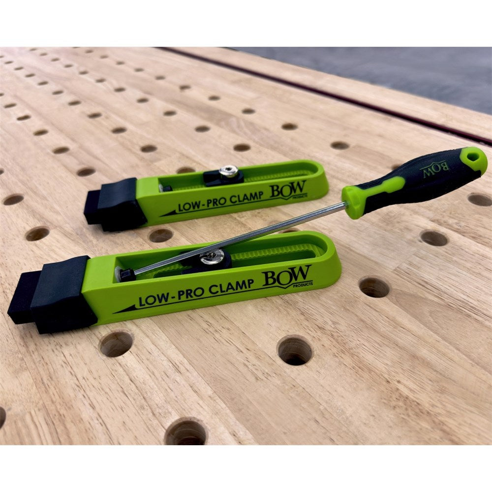 The strong downward clamping pressure offers unobstructed access to work surfaces and edges while securely holding your material down. The clamps have a full 360 deg rotation and 4 linear positioning range. Your new Bow Products Low Profile Clamping Kit also includes the new patented expandable dogs, these are designed to expand symmetrically from top to bottom as compressed. The expandable dogs fit 3/4" diameter holes and grips in holes 1/4" and deeper.Imperial version only.