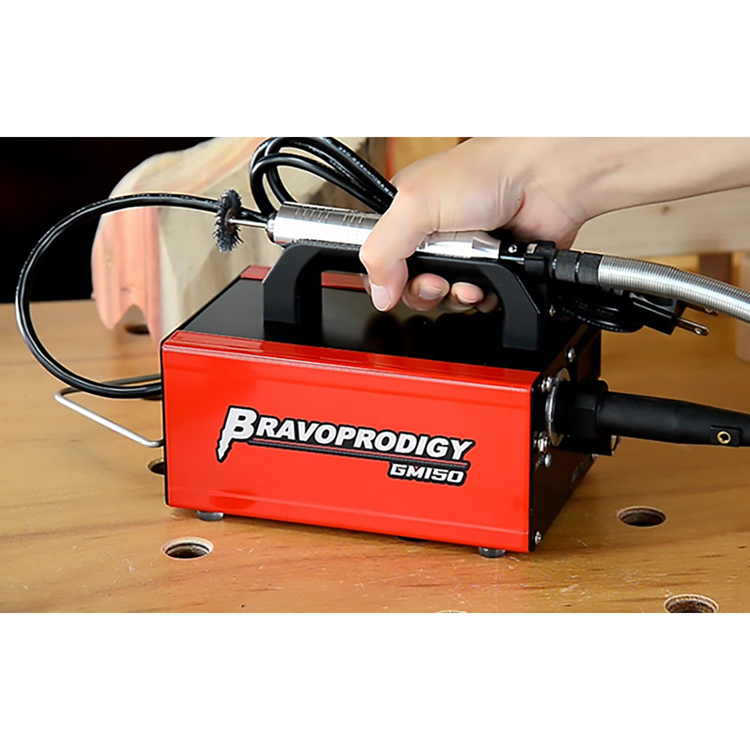 Your Bravoprodigy flexible shaft grinder comes equipped with everything you need to get started right away, including a 1,000mm flexible shaft, a benchtop motor housing with hanger for stability, an integrated handle for easy manoeuvrability, and a convenient ON/OFF foot switch for hands-free operation.