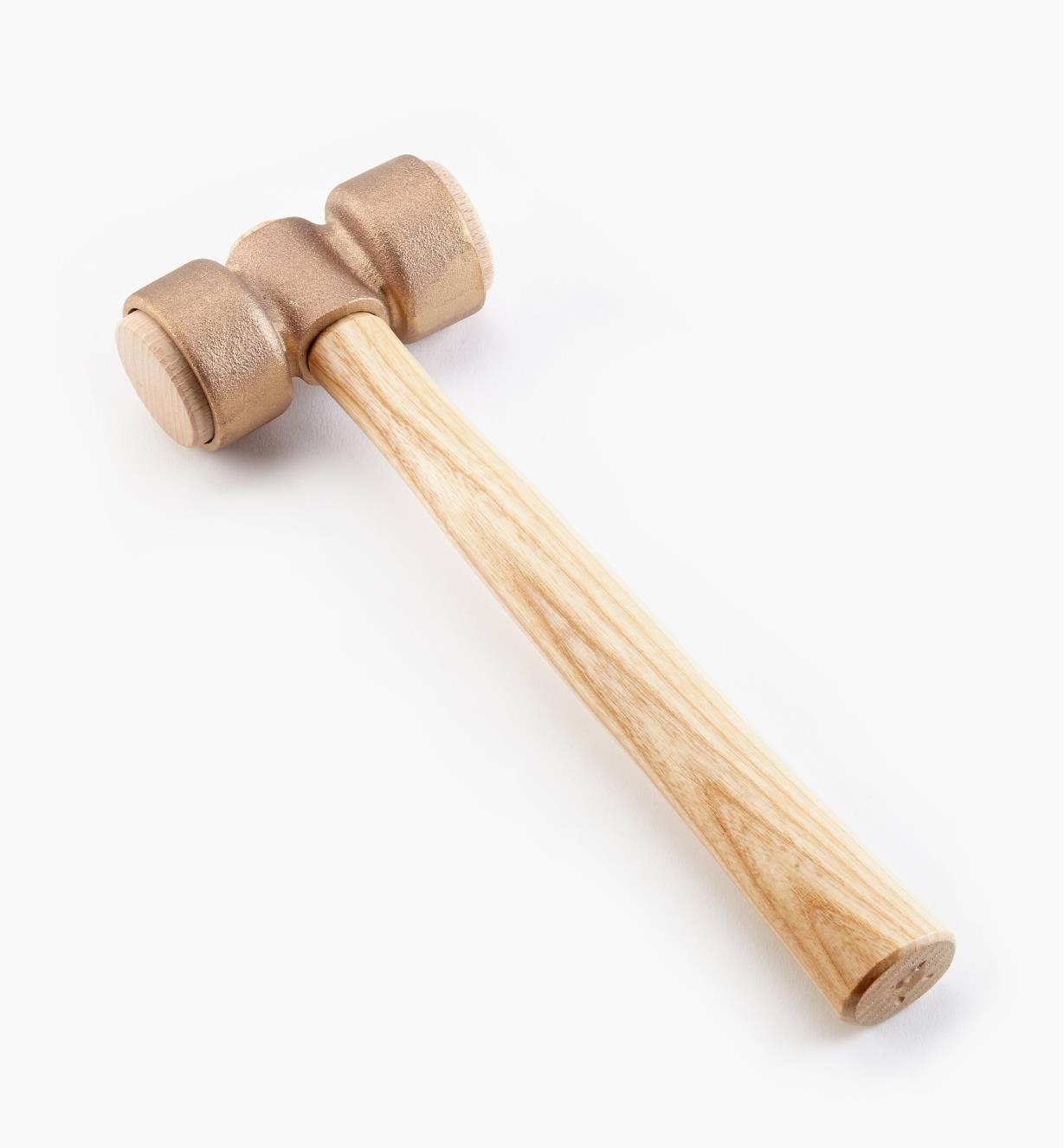 Inspired by a vintage tool in the Lee Valley collection, this mallet has the best features of both wood and metal and is a direct substitute for a carpenter's mallet. The cast brass head has the mass and small size typical of a metal hammer. The 1 1/2" diameter hardwood inserts provide wooden striking faces so you can strike chisels without mushrooming the handles. Since a cabinetmaker's mallet is used primarily with wrist action, the flat faces are in planes that intersect the handle tip, so the face is 90° to the arc of swing to prevent glancing blows. You can also choke up on the handle for work requiring greater finesse such as fine carving.