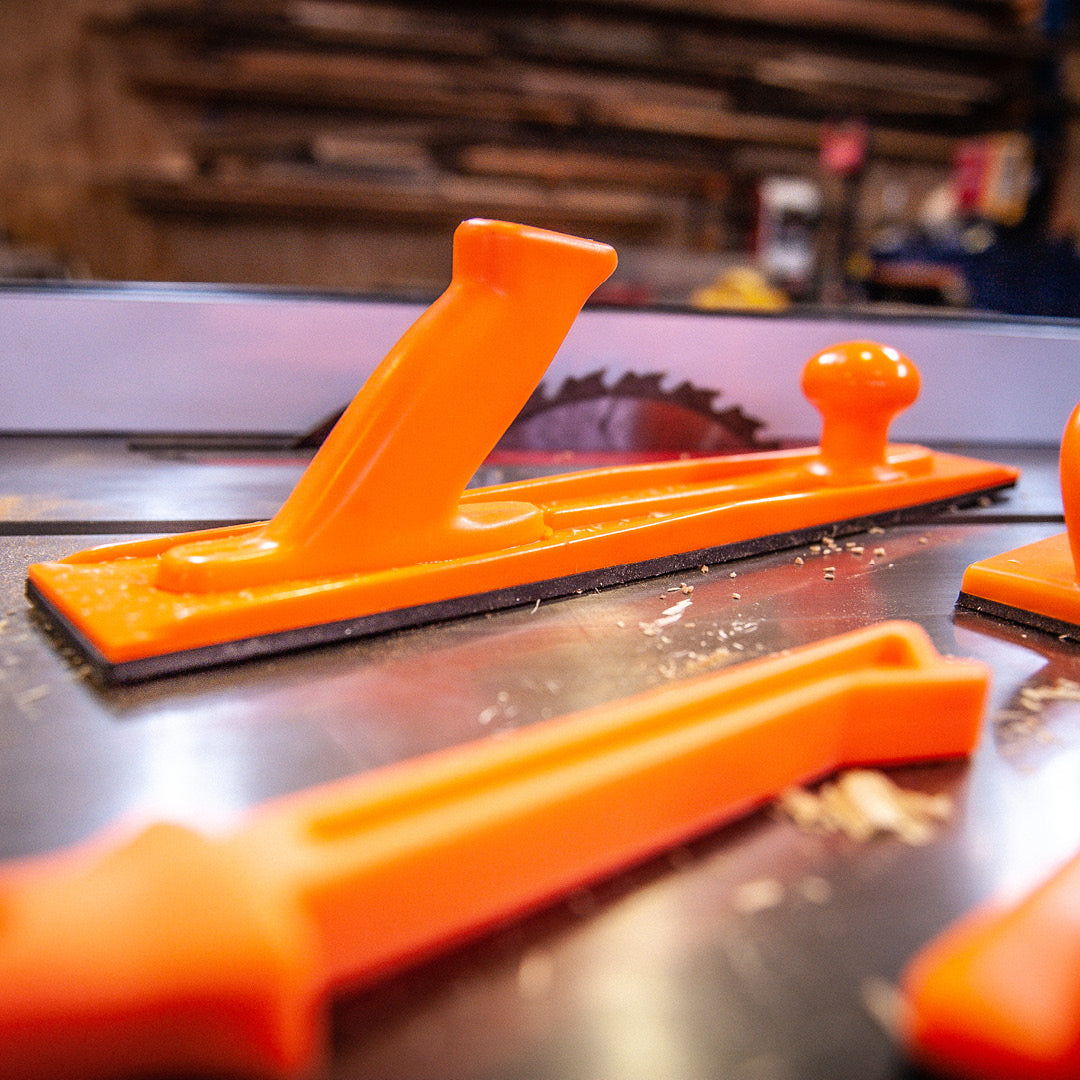 Two separate neoprene faced push blocks, with different handgrips and offsets, for different applications and perfect on Bandsaws, Table Saws and Jointers. The two-handed push block is great on the table sawTraditional handled push stick for general useThin rip push stick where blade and fence are closePlastic construction makes them non-marring and non-damaging