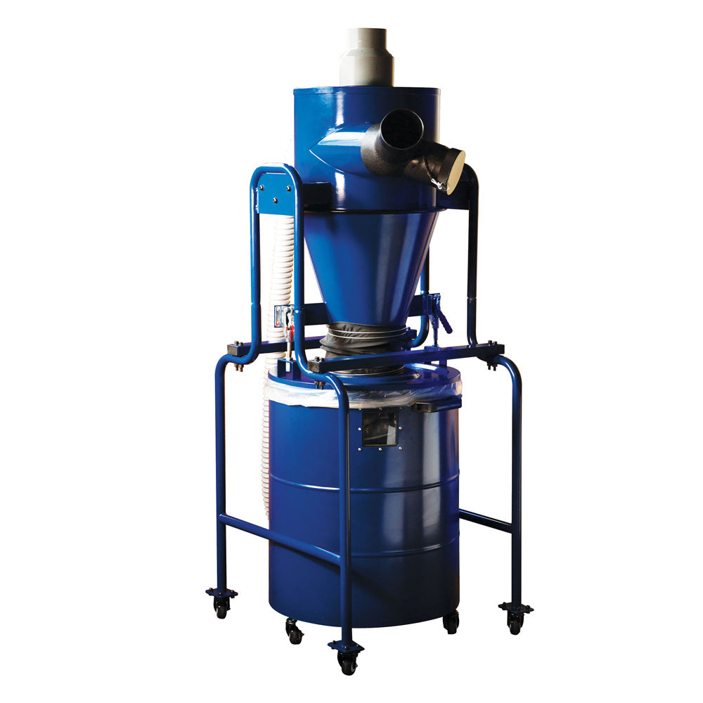 The Carbatec In-Line Cyclone Separator instantly transforms your standard dust collector into a Cyclone! It allows for a 99% dust and chip separation prior to the shavings entering your existing extractor. The precision-engineered cyclone uses the vacuum power created by any standard dust collector to create a powerful vortex to separate dust from air. This unpowered separator cannot increase the suction power of your existing system, but instead does an amazing job of keeping the dust and shavings out of your dust collector. This allows the collector to do the job of creating the vacuum with minimal effort while retaining maximum efficiency. The in-line separator has a large capacity collection drum and holds the majority of your shavings and dust. The included mobile support frame is compact and stable, with no awkward lifting to empty the drum. This machine will reduce the likelihood of your filter or filter bag clogging, resulting in all-round better performance. Breathe life into your tired dust collection system with this instant performance upgrade! Note: Powered dust collector or extractor not included. May require extra fittings to connect to your collector or collection system. Discuss you need with our sales team, or check the website for our massive range of dust collection fittings and accessories.