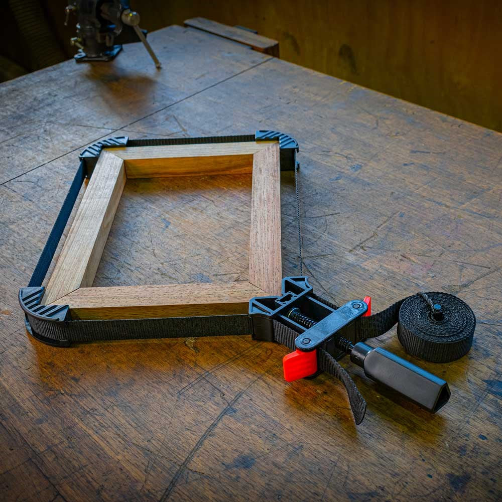 1. Set the corner jaws into position and gently tighten the belt by pulling it tight.