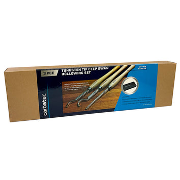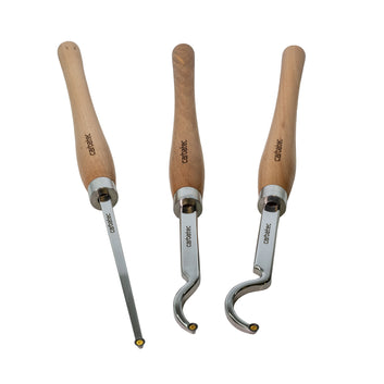 Introducing Carbatec's Next Level Woodturning Series!Our new Tungsten Carbide Tip Series sets are our offering in this very popular "replaceable tip scraper" tool style. All sets feature replaceable Tungsten Carbide cutters, mounted to Solid Stainless Steel shafts. These are coupled with Stainless Steel Ferrules and solid, smooth European Hardwood handles. They are even supplied in very 'giftable' black storage boxes, as shown. This 3 piece extra long set is specifically designed for deep hollowing work. The oversize shanks offer excellent support while projected well past the tool rest edge, as required in deep hollowing work. The extra long handles allow you to leverage the most balanced support required for such demanding work. The curved necks allow for undercutting of the lip often featured in this type of work. The Tungsten Carbide tips hold an edge far longer than HSS, and can be rotated for a clean sharp edge - then replaced when required. This set features 3 tools - one extra long straight and narrow tool for deep, tight spaces; one shallow swan-neck for initial undercutting or gentle inner curves; and one deep swan neck for deep undercuts. The Tungsten Tips on these tools are all round and 9 mm in diameter for detailed scraping. The shanks are laser etched, solid heavy and thick polished stainless flat bar and 175-210 mm in length, while the handles are also laser etched and 390 mm in length. If you want to step up from the basic beginner tools, these sets are for you. Incredible value for the quality.
