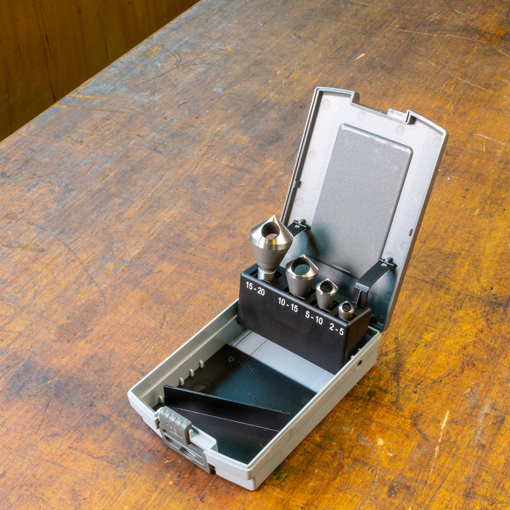 Used primarily in wood and plastic; these countersinks can also be used in soft metals to remove burrs after machining. Each bit has a specific diameter range. Set includes: 2-5; 5-10; 10-15 and 15-20 mm bits in a case. Weight: 545g.