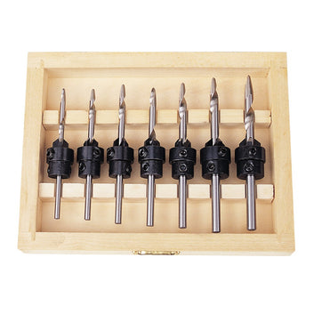 7 Piece Countersink Drill Bit Set All-in-one pre-drilling and countersink bits! Drill screw pilot holes and countersink at the same time without changing drills or bits! Adjustable depth stops ensures the same depth every time and eliminates countersinking too deep Tapered Drill bits designed for both hardwood and softwood Made from High-Speed Steel Wood Screw Sizes Included Drill SizeInch [mm] Countersink SizeInch [mm] 5 1/8 [3. 2] 3/8 [9. 5] 6 9/64 [3. 6] 7 5/32 [4. 0] 8 11/64 [4. 4] 9 3/16 [4. 8] 10 13/64 [5. 2] 1/2 [12. 7] 12 7/32 [5. 6] Includes: 7 x Countersink Drill Bits 7 x Adjustable Depth Stops 1 x Hex Key 1 x Wooden Storage Box Weight 400g.