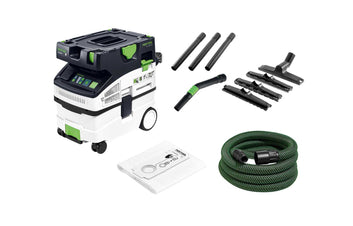 Perfect for mobile work with its compact dimensions, low weight and sturdy wheelsTouch control for intuitive dust extractor operationThe main filter can be changed easily from outsideCleaning accessories come included as standard and are stowed on the dust extractorContainer/ filter bag capacity 15lFlat storage area – ideal for temporary storage of work materialsIncluded:Main FilterSELFCLEAN Filter BagBluetooth® TechnologyRemote Switch On for Cordless ToolsAntistatic Suction Hose D27/32x3.5 mBasic Cleaning SetIntegrated Hose GarageCable WrapSYS-Dock with T-LOC FunctionTool Manual