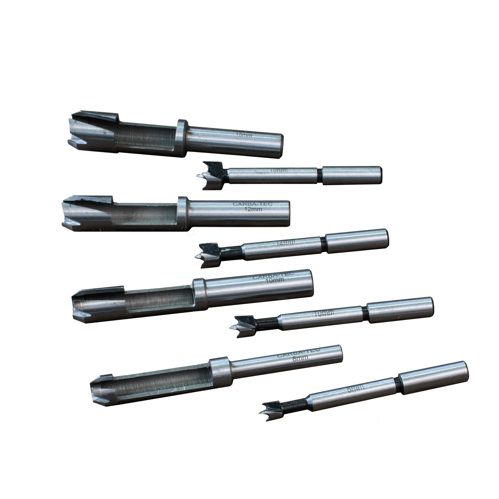 Create flawless plugs and matching holes with the Carbatec Drill & Barrel Plug 8-Piece Cutter Set. This set allows you to hide small blemishes in your timber using plugs of the same species or create a stunning contrast for a unique decorative effect. Designed for use with a drill press, the hardened carbon steel barrel cutters produce perfect plugs up to 50mm long. The set includes the four most popular small sizes to suit a variety of woodworking projects. Elevate your craftsmanship and achieve a professional finish on every piece.