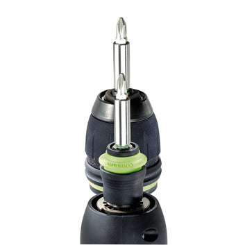 Switch between drill and driving functions in seconds with the FastFix interface, saving time and eliminating the cost of dedicated, single purpose tools. The Festool FastFix based Centrotec Chuck is extremely lightweight and compact. This quick release chuck provides two points of contact for Centrotec bits, allowing them to extend directly into the drill spindle so they serves as an extension of the motor, significantly improving controllability and torque. Reduce fatigue with the lightweight Centrotec chuck and decrease necessary drilling/driving clearance with the compact design. Save time changing between drill and screw bits with the quick-change Centrotec System. Accessory Centrotec bits can be used both with the Centrotec chuck as well as non-Festool standard bit holders and chucks. Works with all existing and previous model Festool drills equipped with FastFix interface for tool less change of chucks: T+3, C12, TDK, TDD, CDD models.