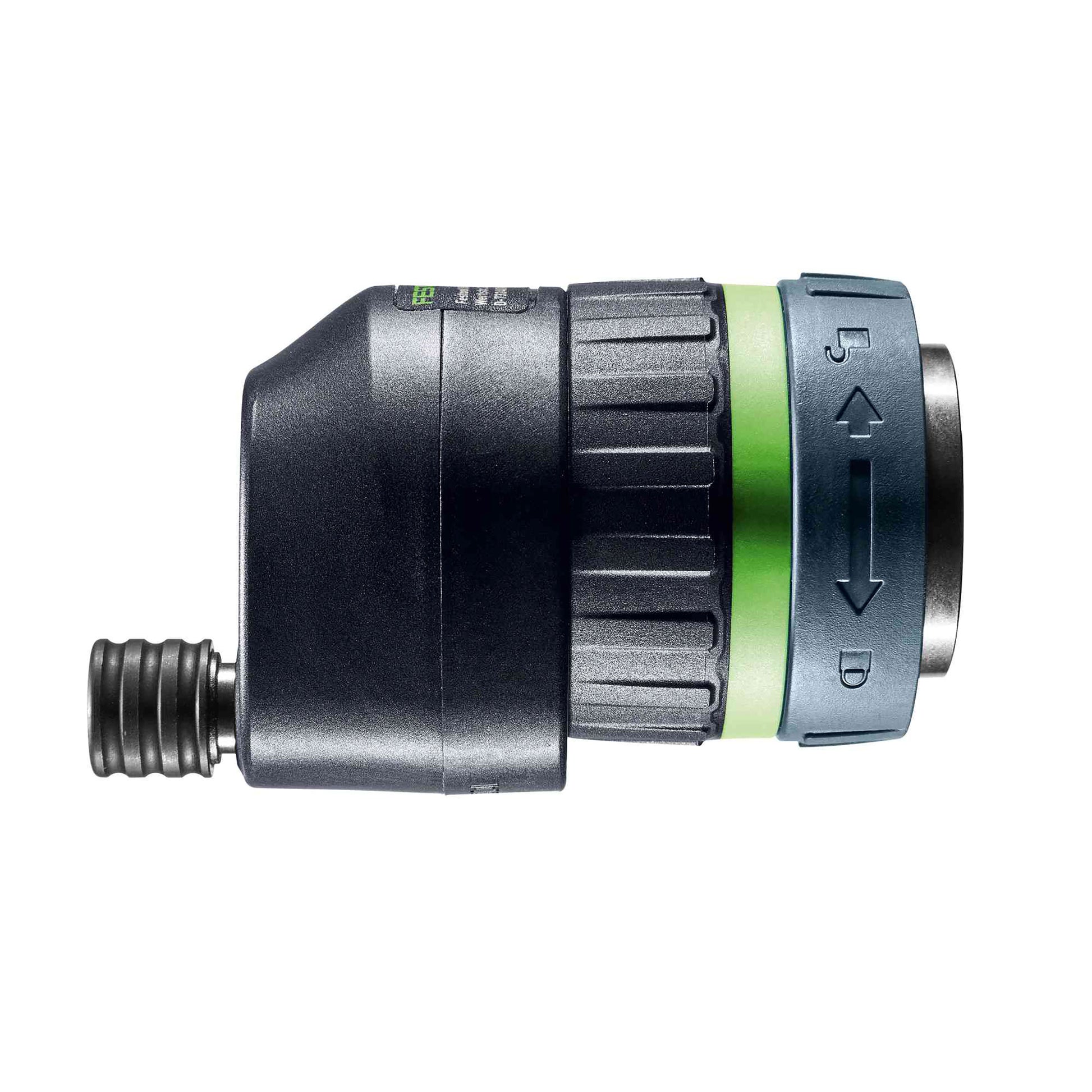 Switch between functions in seconds with the FastFix interface, saving time and eliminating cost of dedicated, single purpose tools. The Festool FastFix Offset Chuck places bits flush to side, enabling access for drilling and driving adjacent to walls and into corners. Adjust the angle simply by rotating the green ring the attachment no longer needs to be released from the machine.