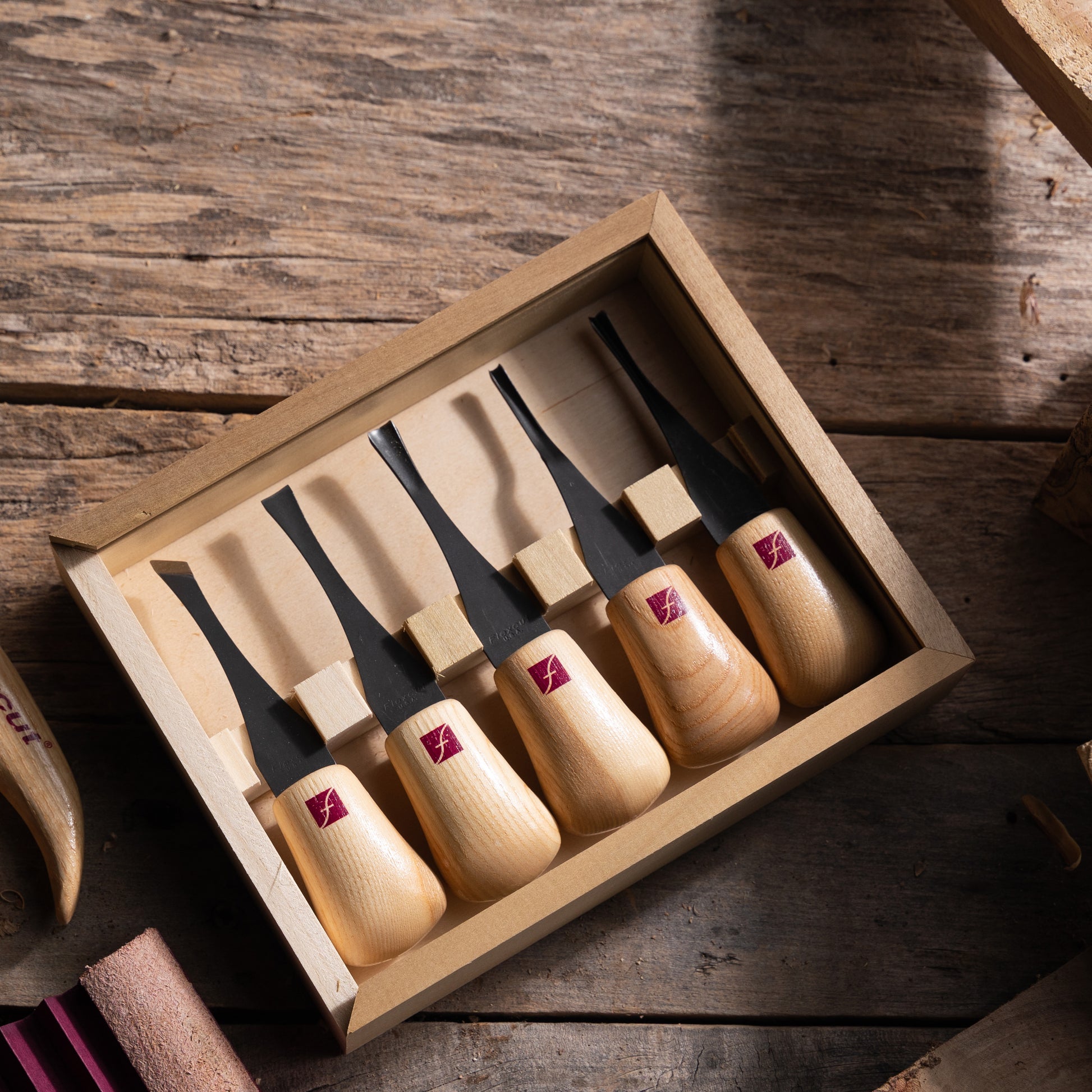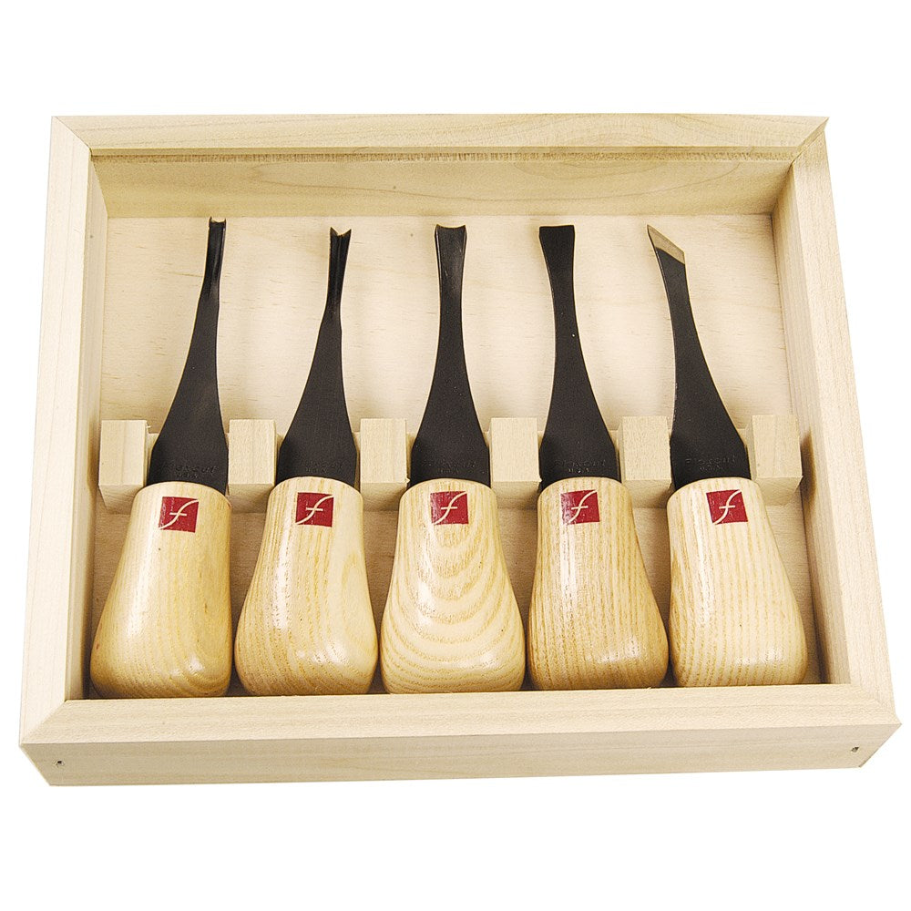 The Flexcut Beginner Palm Set set has three curved gouges, a v-tool and a skew chisel. Perfect for the beginning carver or an ideal choice for the seasoned carver who needs smaller tools for more detailed; controlled work. Set is comprised of five 125mm tools: No. 2 x 10mm gouge, No. 6 10mm gouge, 3mm veiner, 6mm x 80degree v-tool and 8mm skew.