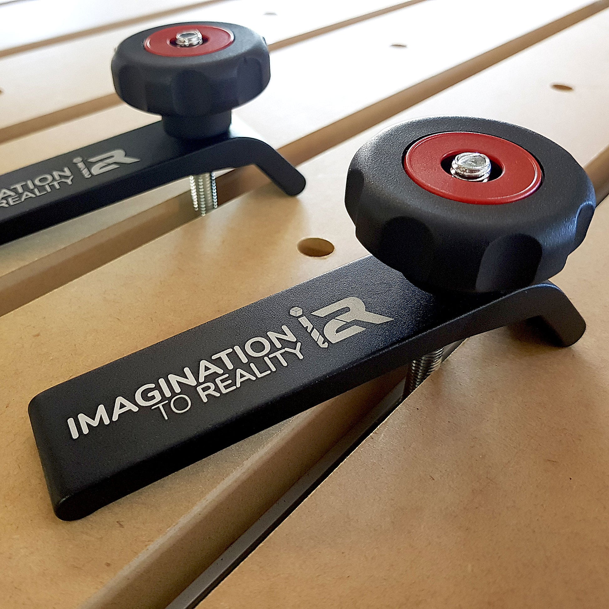 The robust 5/16" T-bolt slides easily into the extruded table T-slots, and is long enough to capture nearly any material up to 75mm (3") thick. The aluminium clamping arm is 28mm (1 1/8") wide by 133mm (5 1/4") long. A large, knurled handle allows you to easily tighten to the desired pressure.These i2R Hold-Down Clamps are sold as a pair - buy two sets (four in total) for an easy to use clamping solution.