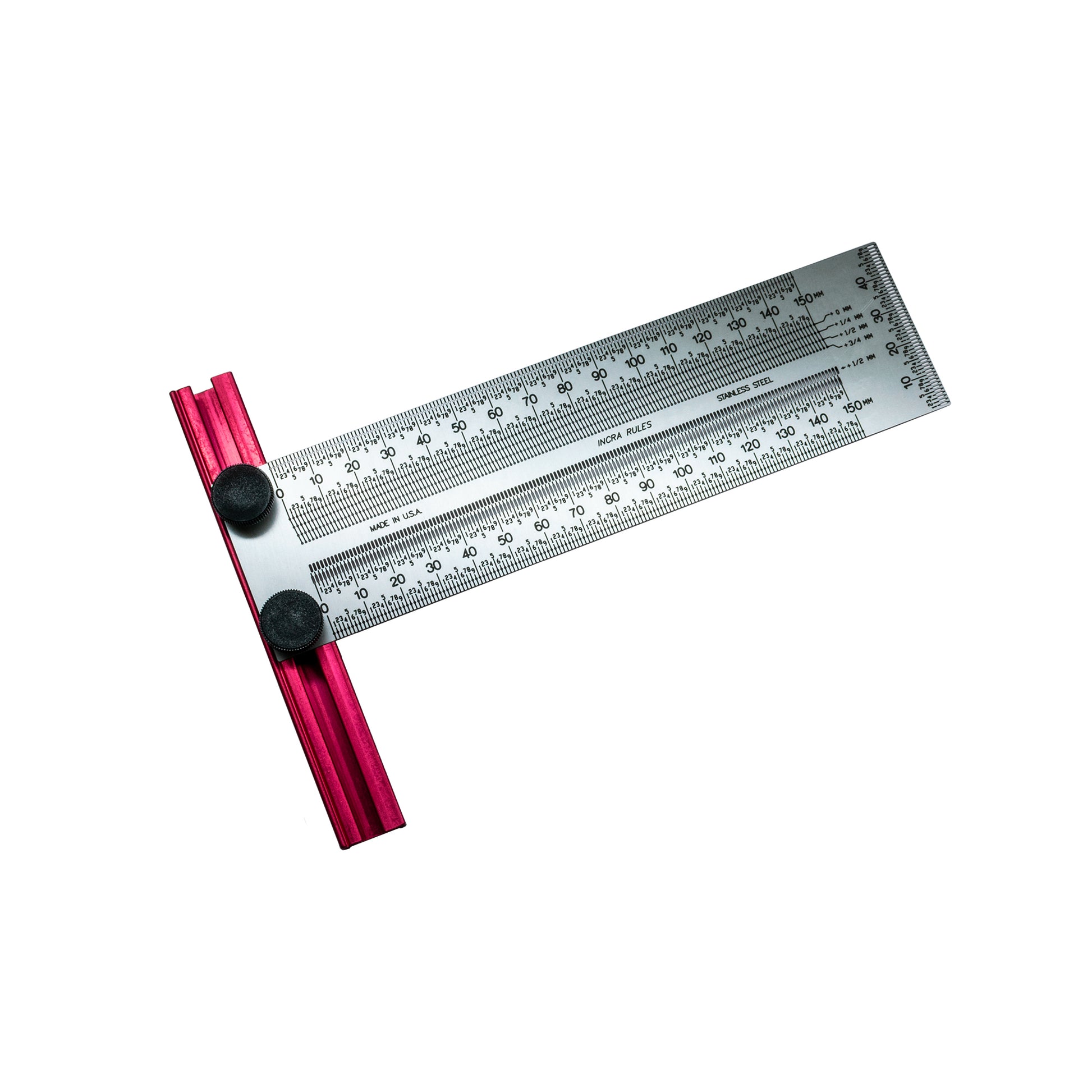 This is our Metric T-Rule shown here is the 150mm version. It is also available in a 300mm length. These rules offer Incra's patented marking holes at every full, 1/4, 1/2 and 3/4mm from 0 to 150mm. They also offer 0 to 50mm height marking slots on the end in millimeters.