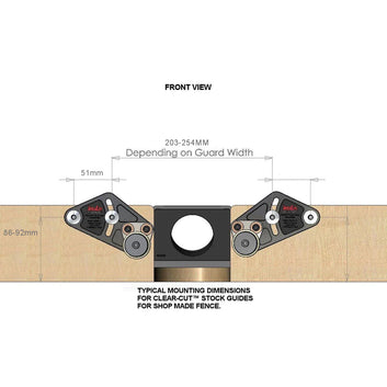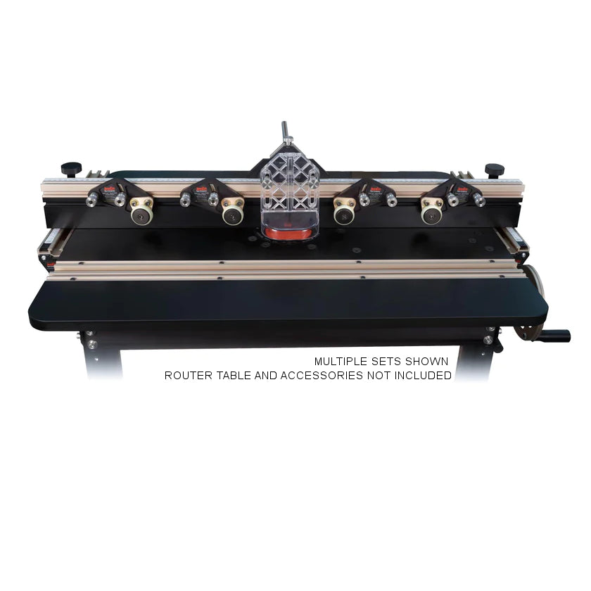 Unique guide rollers mounted on a 5° angle effectively steering your stock towards your fence. This angle causes the roller to hold with more force if the wood tries to move against the direction of the feed.Rollers are fitted with one way roller bearings to ensure each roller spins in the direction of the feed to prevent kickback.Grip force urethane rollers hold your stock securely in positionSet up is fast and easyGuides lock into position along the fence with a twist of the pivot knob and the height setting is controlled with a twist of the clamping knob.For long term routing, the clamping knob is broached to accept a 1/4" hex key to add that extra security you won't lose your settings.Guides mount to a standard 1/4" T-Slot found on most commercially available router table fences.Guides have 69mm of total adjustment.Have complete control of your stock even when routing wide boards or large panels. The dual action of the guides will pull your work tight to the fence. Guides are CNC machined from 6000 series aluminum and anodized for appearance and durability.Roller axles machined from cold rolled steel and case hardened for durabilityRollers designed from wear resistant acetal resinTraction tires are molded out of urethane for long life and superior grip.Accessory kit available for Shop Made Fences