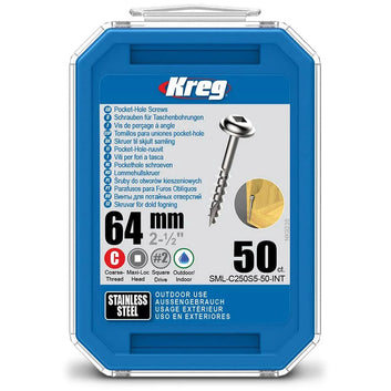 Stainless screws are designed for use in extreme environments that are exposed to moisture and corrosive elements.Coarse thread screws are used with softwoods - as well as plywood, particle board and MDF.Maxi-Loc Kreg Screws have a large head that provides maximum bearing surface as the screw pulls tight in the pocket.Stainless screws are designed for use in extreme environments that are exposed to moisture and corrosive elements.Coarse thread screws are used with softwoods - as well as plywood, particle board and MDF.Maxi-Loc Kreg Screws have a large head that provides maximum bearing surface as the screw pulls tight in the pocket.