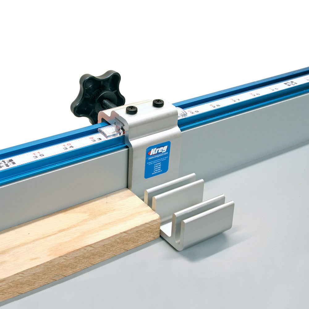 Repeatability is often the key to woodwork, getting the same size components consistently without change. The Kreg Production Stop can do just this when using setups with machines such as mitre saw station, router table, or table drill press or even radial arm saw. It is a fixed stop with a red hairline indicator to ensure accurate readings against the measuring tape.