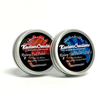 These are the ultimate polishes for Jewellers, Netsuke masters or anywhere small detailed pieces need to be polished! Formulated with a hard set making it stable at high speeds, use these polishes with the various shaped buffing heads available for Dremel® Tools, Archer Power Grinders, Foredom® Tools and similar detail powered rotary tools. Can be used on metals, timbers, plastics, resins and more. Leaves a long lasting and hard wearing high gloss polish.This two piece set contains 1 x 40g Tin of Step #1 (50'000 grit) and 1 x 40g Tin of Step 2 (#100'000 grit).Food grade, non-toxic, non dangerous goods, low allergenic (no colours or frangrances).