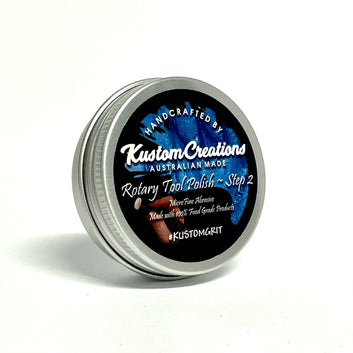 Kustom Rotary Polish is a food grade, low allergenic buffing/ polishing compound, specifically formulated for Rotary Tools.These are the ultimate polishes for Jewellers, Netsuke masters or anywhere small detailed pieces need to be polished! Formulated with a hard set making it stable at high speeds, use these polishes with the various shaped buffing heads available for Dremel® Tools, Archer Power Grinders, Foredom® Tools and similar detail powered rotary tools. Can be used on metals, timbers, plastics, resins and more. Leaves a long lasting and hard wearing high gloss polish.Like the Kustom Grit range, it is available in two "steps", rated at #50'000 and #100'000 grit respectively. Colour coded labels assist in identifying the correct grit quickly: Red = Step 1; Blue = Step 2 and this is carried across other products in the Kustom Range.
