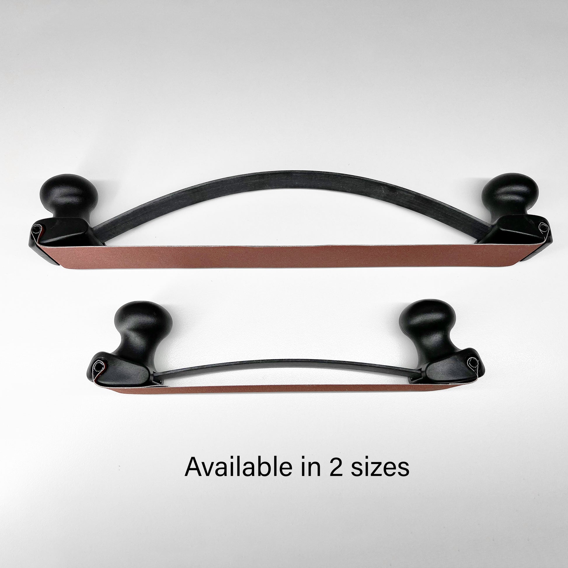 The small bow is about 250mm long. Each bow comes with one 2" × 36" (51mm x 914mm) 120 grit belt, but you can use any belt up to 51mm wide or abrasive strip in any grit, provided it is of suitable length (minimum 450mm for the small bow). You can also adjust the belt tension as needed – tighter for lightly curved surfaces, looser for pronounced contours. No tools are required to change the belt, so you can switch grits as needed to progress from shaping to final smoothing.