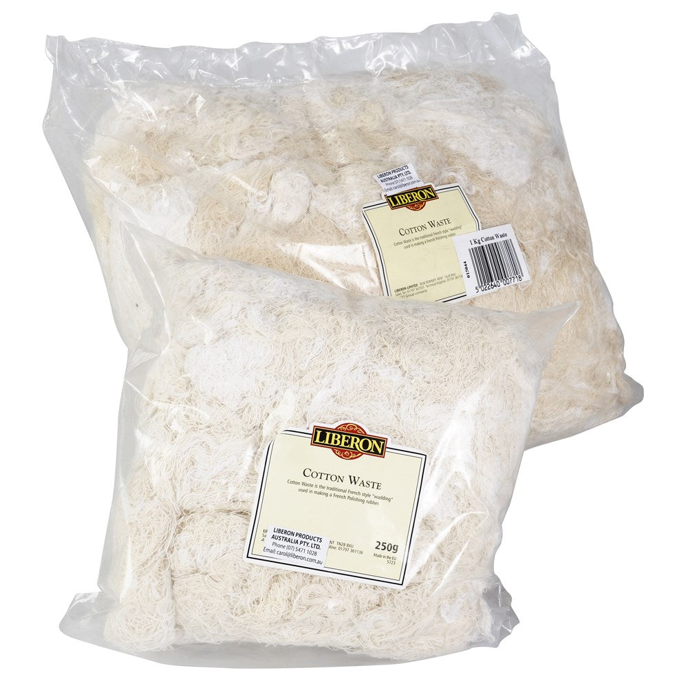 Liberon Cotton Waste is made from pure cotton strands that are used as wadding inside French polishing rubbers. For use with Liberon Cotton Rags to make French polishing rubbers that are easy to shape and that allow the French polish to flow evenly. To make a French polish rubber take a fist size amount of cotton waste, place in the centre of a cotton cloth (approximately 30 cm2 in size), pull the corners together and twist to a ball shaped pad.