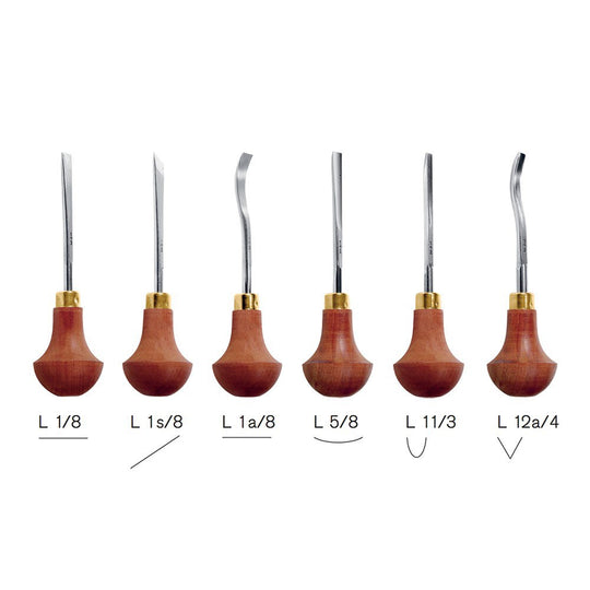 Palm chisels with Pear handles; ideal for small and detailed wood carving or lino print work. Tools are of the same high quality as all Pfeil carving tools; precisely ground and polished. Overall length 125mm. Blade length 70mm.