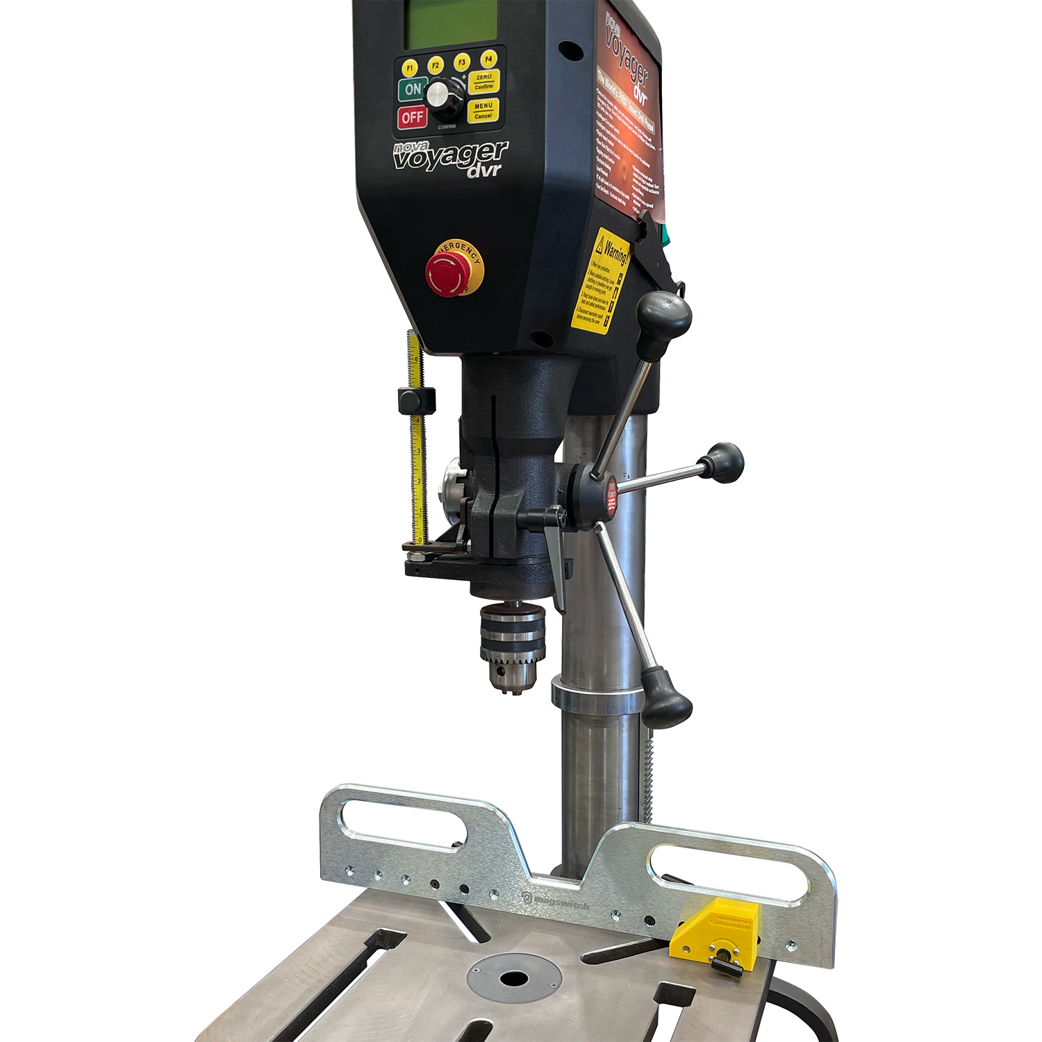 NEW from Magswitch - an even BIGGER Magnetic Drill Press Fence, the PRO!Made from a solid piece of steel, machined all round for an ultra-flat and square surface. The fence is supplied with 2 Magswitch toggle activated magnets( Mag-Jigs), that can be adjusted in their mounting positions via the multiple drilled holes, to suit just about any width of table. These custom Mag-Jig's also feature a rubber grommet underneath that provides some cushioning and friction to the attachment, for a very secure lock to your table.The fence is designed with a cutaway centre, to allow for clearance of the chuck when drilling close to corners and edges. Also included is an infinitely adjustable stop, for repeat drilling operations. This is also actuated via a Magswitch toggle and as the fence is steel, can be positioned anywhere you need on the face. With both 90˚ and 45˚ faces, setup for just about any repeat drilling operation is quick and simple.Dimensions of the Pro Fence are : 533mm x 109mm x 11mm (Steel Fence excluding the Mag-jigs and Repeat Stop)A deceptively simple yet exceptionally functional, easy-to-use, premium fence offering to upgrade your drill press. Also available in a smaller format, to suit just about any drill press.*NB: Drill Press not included!!