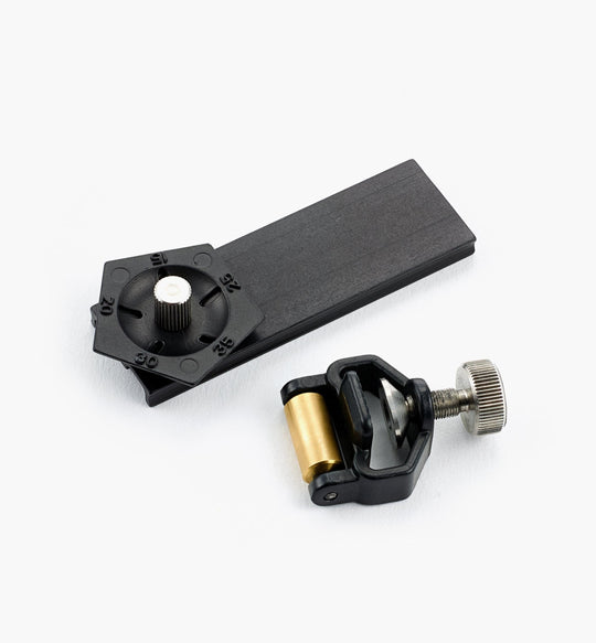 Veritas have produced miniature versions of some of their tools for years, and while they certainly have appeal as collectibles, each is fully functional. To support their utility, this honing guide is a natural extension, so that those who use our miniature chisels and planes can keep the blades properly sharpened.A 1:3-scale version of the Veritas sharpening system, it consists of a honing guide and an angle jig. The honing guide has a die-cast aluminum body that rides on a brass roller and accepts blades up to 3/4" wide; the stainless-steel clamping knob holds the blade against a pad in the guide. The angle-setting jig has a 2 1/2" long base and a 5-sided wheel that you can turn to a selected facet. You can use it to set your blade angle to one of the five most common bevel angles (15°, 20°, 25°, 30° and 35°). With the blade loosely held in the honing guide, simply roll the guide up to the wheel and clamp the blade. You can return to exactly the same angle each time you want to hone a blade, ensuring accuracy and reducing sharpening time.
