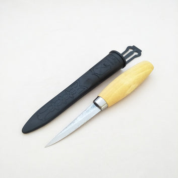 A straight bladed knife with a long blade for quickly removing material when carving such items as spoons, bowls etc. The handle is made from Birch wood, and has a natural feel to it, which can also be carved to suit the individual needs of the user.Blade Specifications: