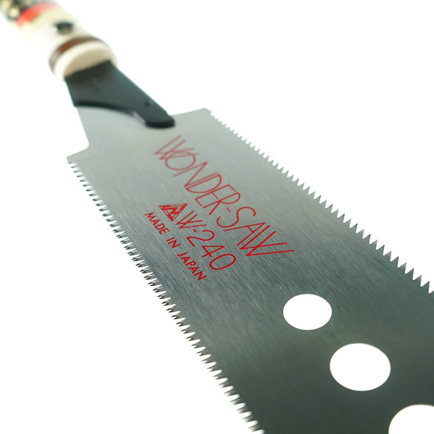 This premium Nakaya Ryoba saw is a veritable multi-purpose tool!Ryoba saws feature two cutting sides - one for ripping and one for cross cutting, hence the "Wonder-Saw". The blade stock is slightly thicker at a whopping 0.45mm (!) and lacks a rigid spine allowing full through cuts on thicker or longer stock, whether ripping or cross-cutting. The holes in the blade are said to reduce friction in through cuts. Be it by this special design or another, we can attest to the cutting ability of this blade!The specially hardened Japanese teeth are multi-faceted on the cross-cut side in the style of Dozuki saws, while the ripping side are a more traditional looking handsaw tooth style though in a variable pitch arrangement - both sides cut extremely efficiently on the pull stroke, as per the Japanese fashion.This model has a 240mm blade which is fully replaceable, set in a traditional rattan wrapped timber handle.