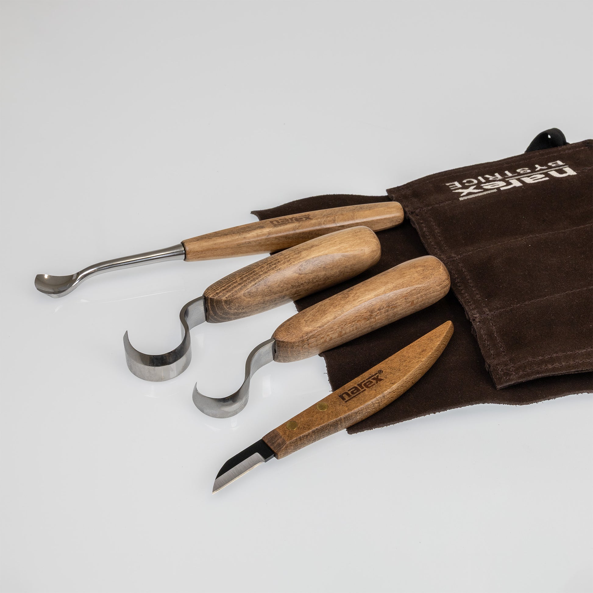 The blades are forged from highly alloyed Cr-V steel and heat-treated to 55 HRc for strength and long-lasting durability. The ergonomic handles are crafted from natural beech wood with an oiled finish and feature an octagonal cross-section, providing a comfortable and secure grip even during extended carving sessions.