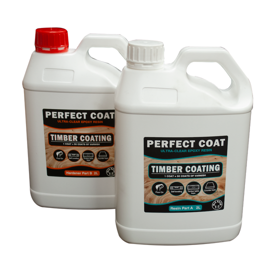 Perfect Coat is a solvent free, liquid epoxy resin specifically designed as a crystal clear, high-gloss coating system for timber coating that will self-level, and cure at room temperature.Kit contains 2 litres of Resin and 2 litres of HardenerMixing resins by weight is a lot more accurate than by trying to mix it by volume. This is done using digital scales; place a clean mixing container onto the scales and zero it. Pour in the required amount of part 1, take the weight and multiply by 0.88. Zero the scales and pour in part 2 COATING 1:1 by volume / 1:0.88 by weight