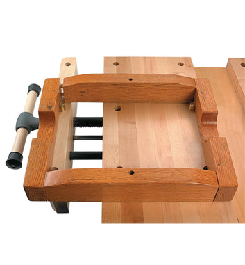 Using the same quick release mechanism as our tail vise; our front vise has a simple on-off cam lever to engage or disengage the Acme threaded screw; allowing it to apply up to 180kg of force in either clamping or spreading applications. The screw mechanism provides 310mm of overall travel (less the thickness of your wooden jaw and bench apron). Tight body tolerances result in minimal jaw sag; even at full extension. An extruded aluminium screw cover keeps debris out of the screw mechanism and prevents the workpiece from contacting the lubricated screw. Straightforward to install in new construction or as a retrofit to an existing bench; the vise requires an unobstructed mounting area on the underside of the bench top at least 300mm wide by 405mm deep (with a 50mm thick bench apron and a 44mm thick jaw). The body is ductile iron with zinc-alloy endplates; steel shafts and guide rods; and a maple handle. Mounting instructions and hardware included. Made in Canada. Patented.