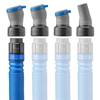 The kit includes four FlexiPorts of varying diameters, plus the Click-Connect Hose Adapter, which threads into the included Expandable Hose (now in blue). The blue hose is lighter in weight than the older black hose, for less tendency to pull on your tools. Three of the four FlexiPorts have a clasp that you can ratchet down for a secure connection to the tool. Finally, a vent collar lets you adjust the suction level, perfect for reducing swirl marks when orbital sanding.