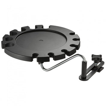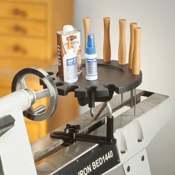 Wouldn’t it be good to have all your turning tools close at hand, and not need to reach for them. Specially designed to fit most flat bed lathes to hold up to 6 standard sized turning tools, and 6 miniature sized turning tools around the circumference and other tools and accessories in the centre.