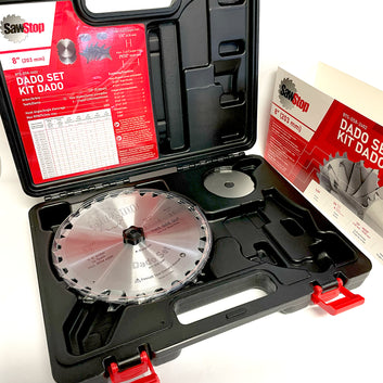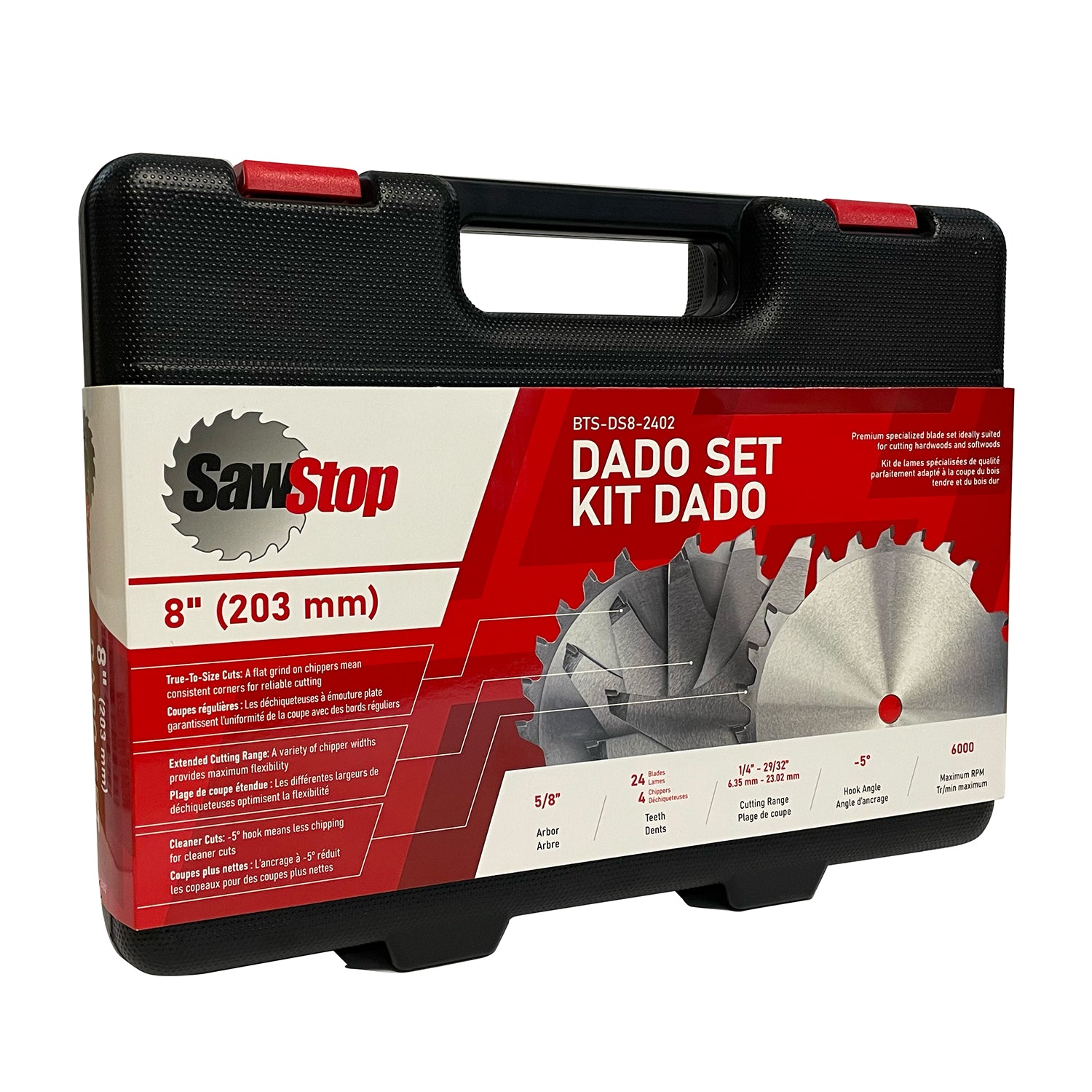 Get unmatched performance from SawStop's all-new Dado Set!This premium specialized blade set is ideally suited for cutting and channeling both soft and hardwoods. It provides exceptional cutting performance and offers a variety of chipper widths to give maximum flexibility and precision.The flat grind 4 tooth chippers in a variety of thicknesses along with shims, offer easy customisation and a wide range of channel widths from 1/4" to 29/32" (6.35mm to 23mm). The outer left and right 24 tooth blades provide clean corners for easy glue-ups right off the saw.SawStop machine compatible, this Dado stack is ready for any project!NB* Requires use of SawStop's Dado Brake Cartridge and appropriate table insert.