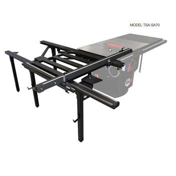 SawStop have developed their sliding table, to complement their Professional and Industrial Saw range, without any mobile bases.This exceptionally well engineered sliding table offers a weight rating of 158Kg, and allowing both safety and accuracy on the worlds safest tablesaw. For those needing to cut sheet material safely and accurately, 14 sealed bearings support a rigid steel frame along the 1.8m length.In any form of woodworking, safety is obviously important, which is why SawStop exists, repeatability is another huge factor, with the fence accommodating fold away stops for allowing materials to be cut, the swung out of the way to remove the cut pieces, and then lowered again for the successive pieces.Machined detents at 0°, 15°, 22.5°, 30° and 45° make those commonly used angles quick and easy to select when mitres and angles are required. There was a need for it, and SawStop have come through with the solution.*NB: Installation requires minor modification to your Fence Rail. Not compatible with Mobile Bases (no capacity to lift the Sliding Table Assembly). You will need to allow one full day to complete assembly, installation and adjustment.High Level Specs:Nett Weight - 78.5KgWeight Capacity Fully Extended - 158KgSliding Table Dimensions - 762mm x 775mmMaximum Table Travel - 1816mmMaximum RIP Capacity (Front Mounting) - 1244mmMaximum RIP Capacity (Rear Mounting) - 1778mmOverall additional workshop space required is 1900mm Width, 2400mm Length