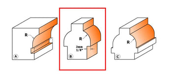 These bits allow you to make true divided light doors for fine furniture and cabinets as well as sash bar windows; and stile and rail constructions. The glazing bar ovolo bits are bearing-guided to enable curved frames to be moulded. Cove bits can be used to produce easy-to-pull drawer handles. A = 855-307-11M B = 855-307-11F