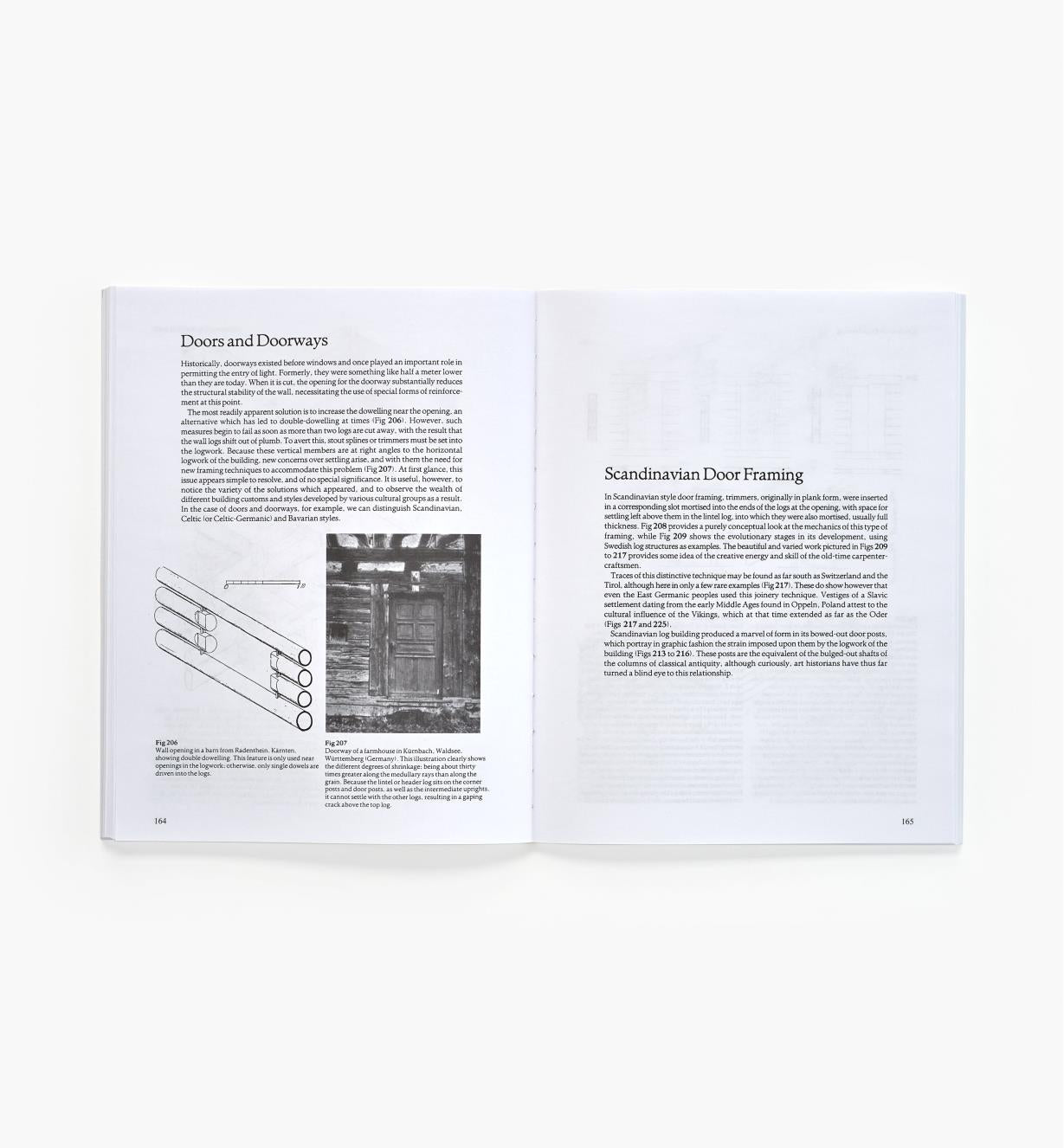 A definitive look at building with logs. Originally published in Germany, this 328 page book contains more than 500 photos and covers everything that from the properties of wood, felling methods all the way to decorative moulded contouring. While this books talks about log building, the techniques are transferrable to other building and furniture construction. Detailed chapters cover foundations and sills, log walls, cornerwork and partition wall joinery (including intricate notching techniques), roof framing and more. Additionally, this book also includes sections on subjects such as pegging and dowelling, sod roofing, thatching, shingling and shingle making, floor and ceiling construction, cantilevered features and decorative moulded contouring. The exceptional draftsmanship is one of the most striking features of the work, revealing intricacies of both constructional detail and frequently complex joinery, often in cutaway views.