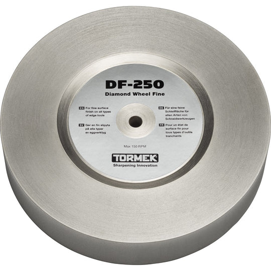 The fine diamond wheel from Tormek has a grit equivalent of 600, is an all round wheel combining removal of steel to providing a smooth finished surface. Materials such as steel, ceramic and carbide can be sharpened using the new diamond stone range, and can be mounted to the current T-8 model, previous T-7 model and earlier models that use a 250ml diameter wheel. The diamond stones give the same grind as the water stones using the outside edge, without the need to truing and as a result will not reduce in diameter, with the added benefit of being able to sharpen using the face of the wheel and achieving a flat grind previously not possible with the water stones, using the new MB-100 Multi Base.Included with every wheel is a 150ml bottle of anti-corrosion concentrate to prevent rust forming on the grinding wheel, use this in a 10ml to 250ml ratio.