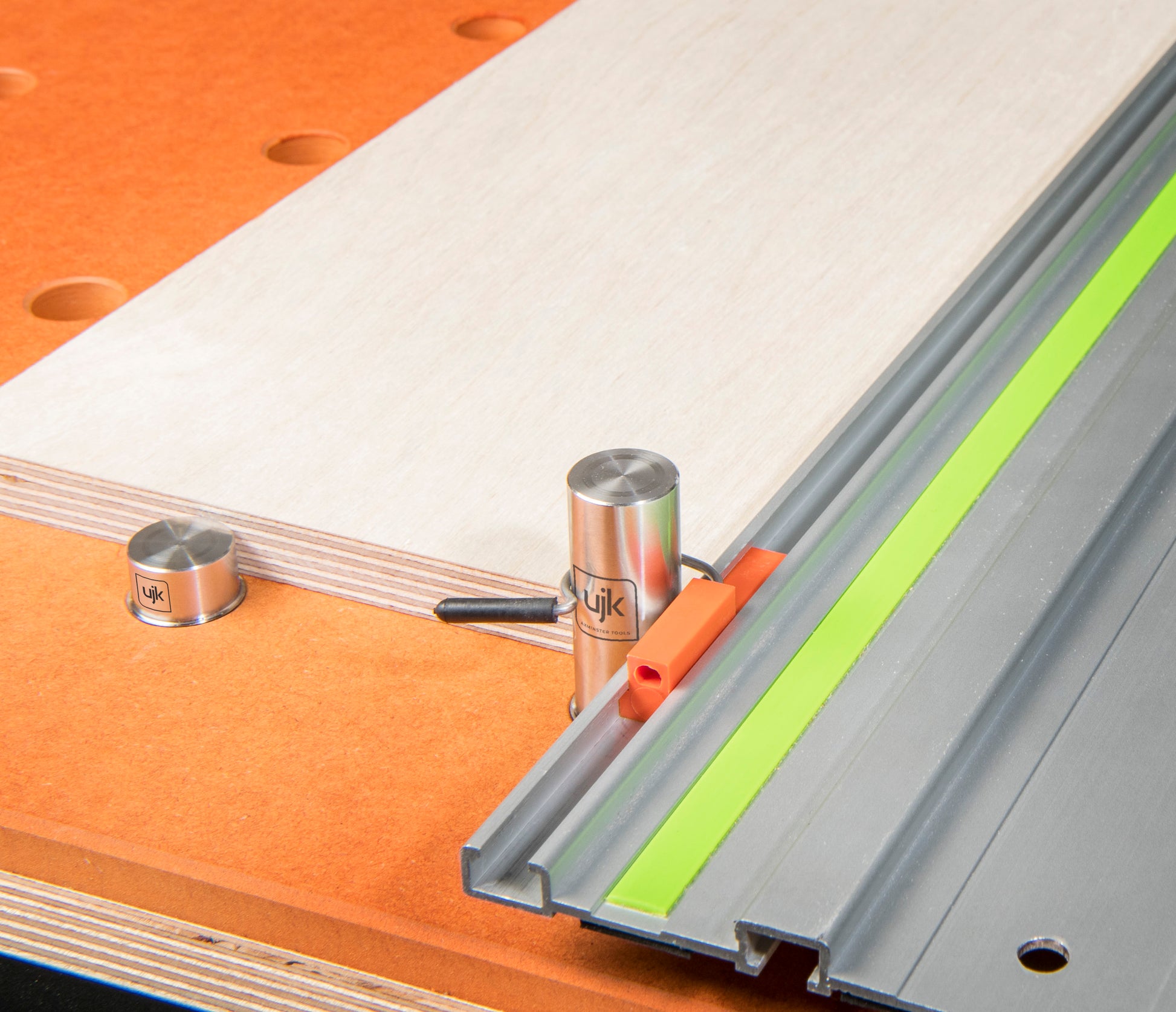 Supplied as a pair, these UJK Guide Dogs fit exactly into the 20mm holes of the UJK multifunction workbench. They are compatible with the Festool MFT/3 tabletop and similar grid tables with chamfered 20mm holes.CNC machined from 303-grade stainless steel, the Guide Dog has a 12mm projection above the tabletop. The lower profile makes the Dogs ideal for situations where a taller dog would cause an obstruction. At 20mm diameter, it is fully compatible with many other multifunction bench accessories.The stop collar fits into a chamfer around the dog hole, providing a register that guarantees the dog sits perpendicular to the work surface and ensures a flush fit at the base. A UJK Chamfer Cutter is available to modify tables with plain holes, or you can use a router with a bevel cutter to create a slight chamfer. When used in pairs the precision fit of the Dog is perfect for fixing other items or jigs with corresponding 20mm holes.
