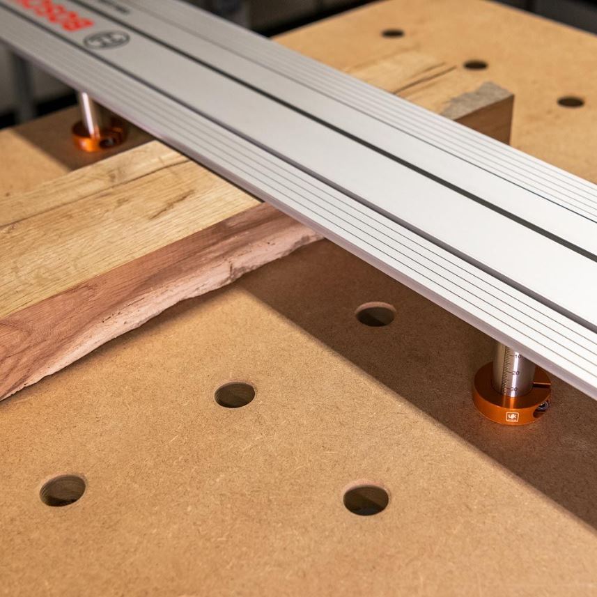 Using these dogs, there is never any chance of your saw cutting across other dog holes. This method of fixing your guide rail is particularly beneficial when using power tools with higher vibration levels, such as routers.