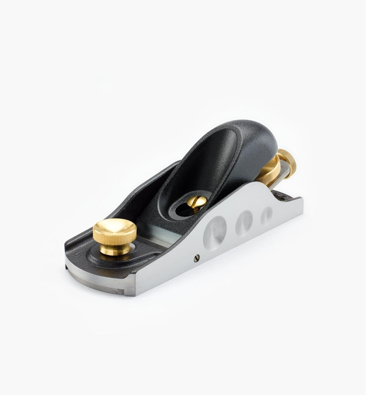 These block planes stand apart from the rest. The tall side wings are ideal for shooting, and finger grips in the sides improve control. The combined blade advance and lateral adjust is the most sensitive, accurate adjustment mechanism available. Two guide screws prevent blade shifting. The ductile cast iron body can take hard knocks, and the adjustable nosepiece does not extend past the body, so it cannot be driven into the blade if you drop the plane. Planes are machined to exacting standards, with milled sides and soles that are surface ground to a fine finish.