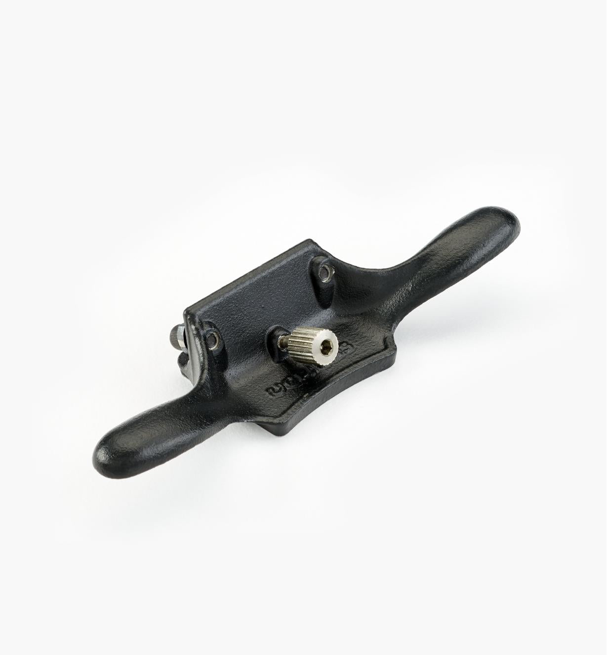 A thumbscrew lets you camber the blade to prevent blade corners from leaving ridges in the work. The handle position lets you apply force directly in line with the cutting edge.