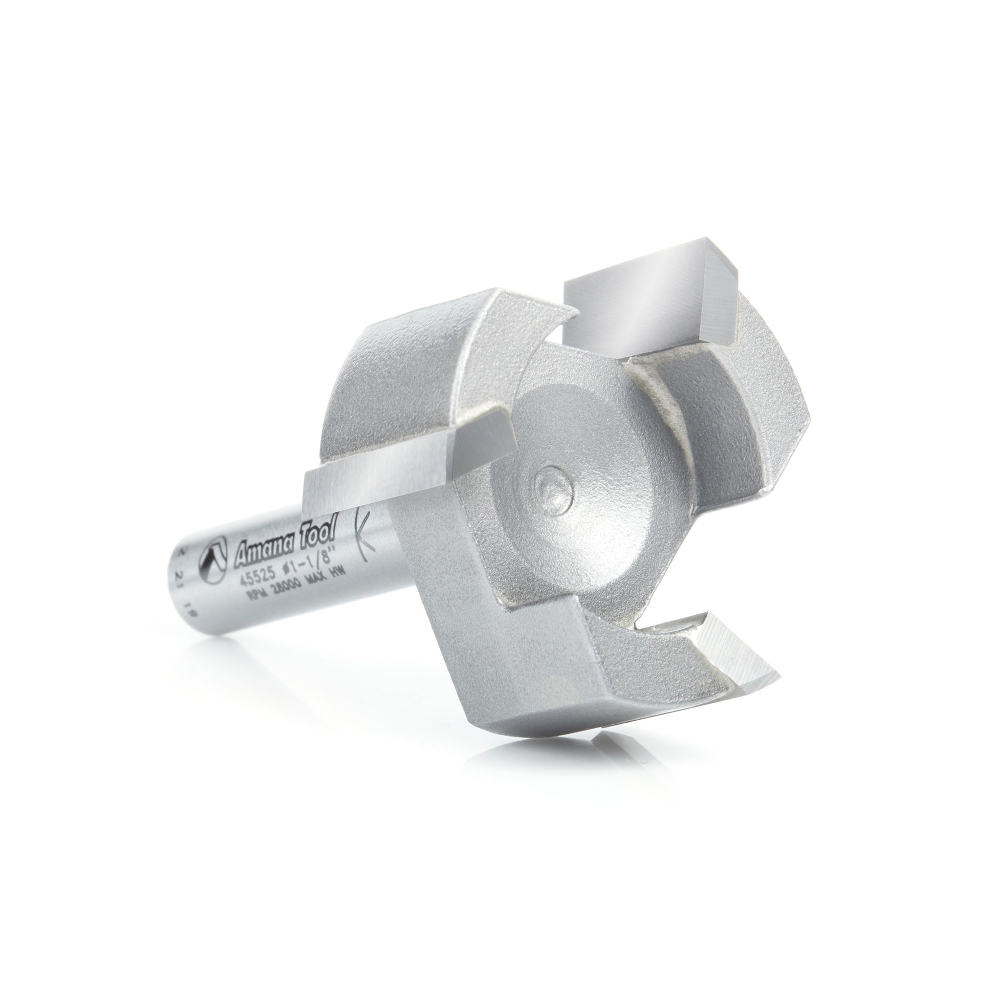 Amana Carbide tipped spoilboard surfacing & rabbeting router bit great for cutting tight corners and surface planing.(D) Diameter1-1/8(B) Cutting Height1/2(d) Shank1/4Overall Length (L)1-13/16Max RPM28,000Flutes3